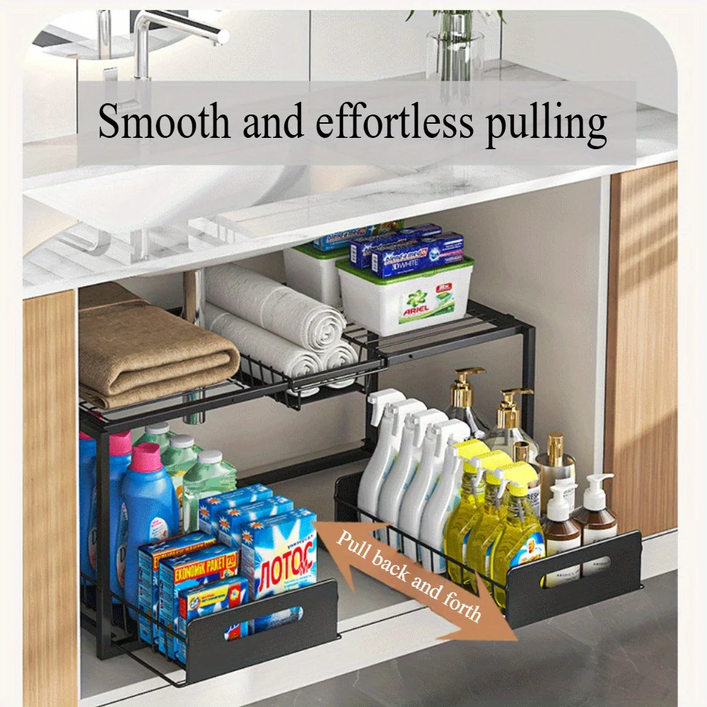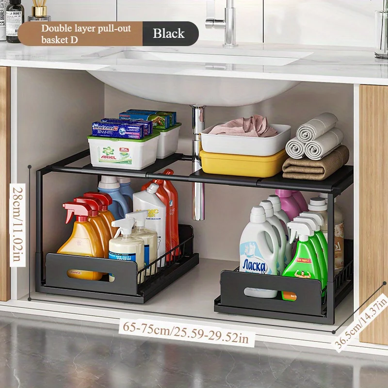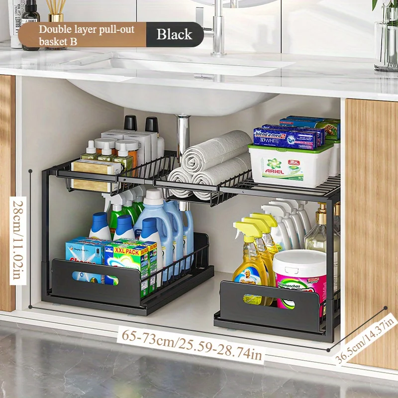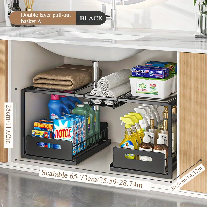 Prateleira de armazenamento de dois níveis para debaixo do lava-loiça - calha deslizante ajustável com puxador de arame, permite armazenar mais artigos e poupar espaço.