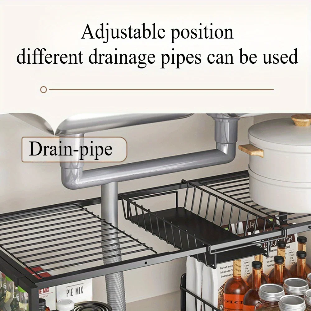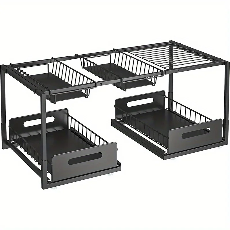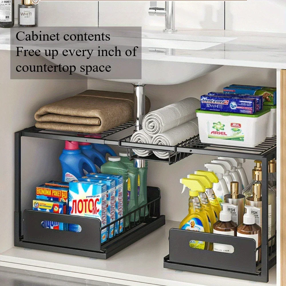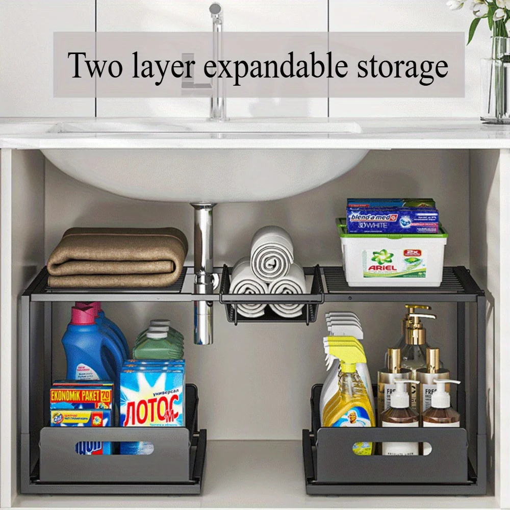 Prateleira de armazenamento de dois níveis para debaixo do lava-loiça - calha deslizante ajustável com puxador de arame, permite armazenar mais artigos e poupar espaço.