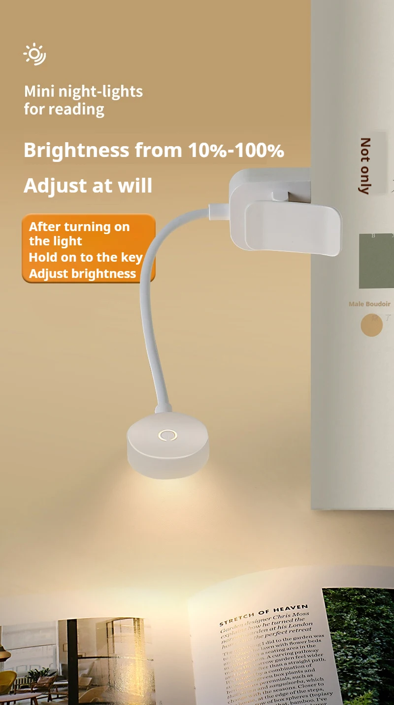 Mini candeeiro de leitura LED portátil com clipe, 3 modos de iluminação, proteção ocular, alimentada por bateria, intensidade regulável continuamente, ideal para cabeceira ou estudo.