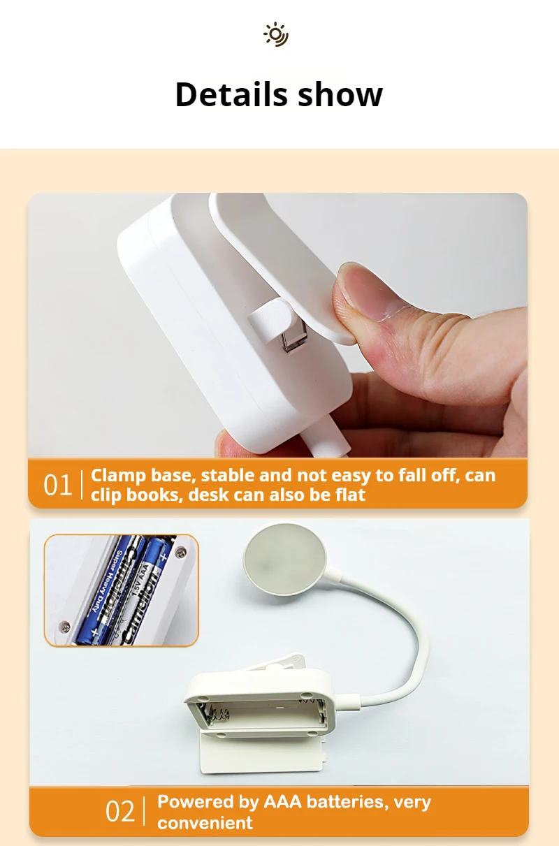 As luzes de leitura são mais pequenas e mais leves do que outras luzes de leitura semelhantes. Permitem-lhe desfrutar de uma experiência de leitura relaxante e de uma iluminação auxiliar a qualquer hora e em qualquer lugar. Liberte as mãos para ler antes de dormir, trabalhar, viajar, acampar, tocar música, etc.